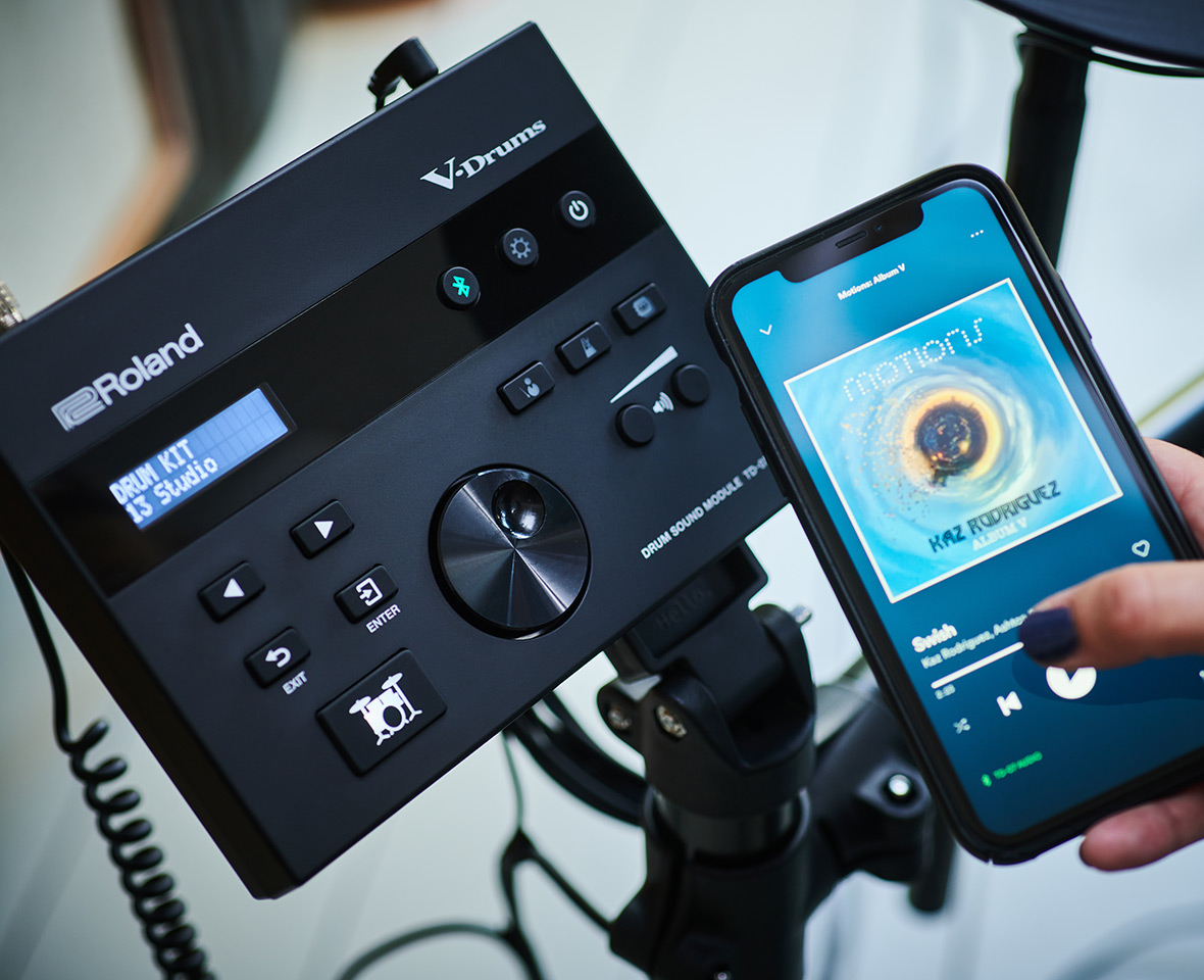 The TD-07DMK makes it easy to drum along with your favorite bands. Just select the music on your smartphone, tablet, or computer, then wirelessly stream the audio through to the TD-07 module as you join in. Video sound is transmitted too, so you can play along with online songs and video lessons. And if your device doesn’t have Bluetooth, just bring in stereo sound via an audio cable. MIDI over Bluetooth is also supported for cable-free recording of MIDI data in music apps.